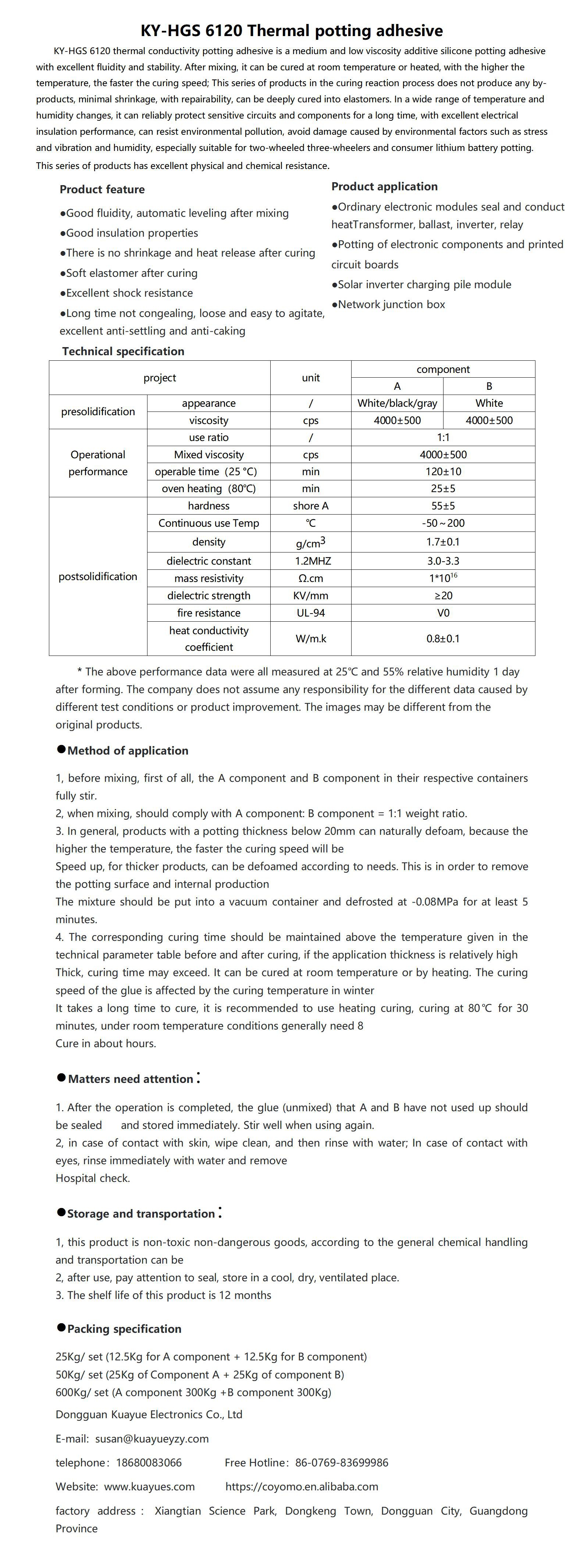 KY-HGS 6120 thermal conductivity potting adhesive is a medium and low viscosity additive silicone potting adhesive with excellent fluidity and stability. After mixing, it can be cured at room temperature or heated, with the higher the temperature, the faster the curing speed; This series of products in the curing reaction process does not produce any by-products, minimal shrinkage, with repairability, can be deeply cured into elastomers. In a wide range of temperature and humidity changes, it can reliably protect sensitive circuits and components for a long time, with excellent electrical insulation performance, can resist environmental pollution, avoid damage caused by environmental factors such as stress and vibration and humidity, especially suitable for two-wheeled three-wheelers and consumer lithium battery potting. This series of products has excellent physical and chemical resistance.