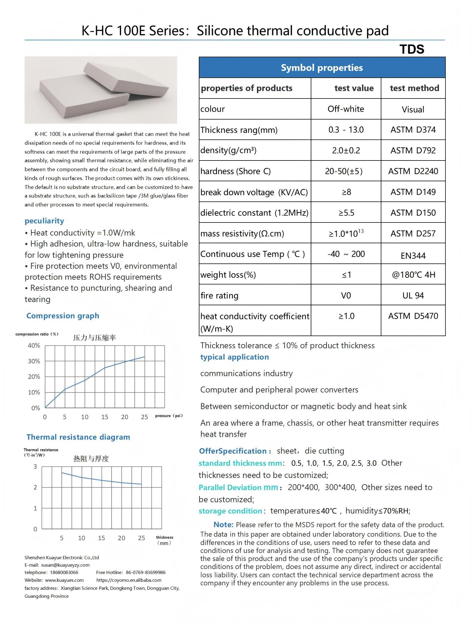 K-HC 100E is a universal thermal gasket that can meet the heat dissipation needs of no special requirements for hardness, and its softness can meet the requirements of large parts of the pressure assembly, showing small thermal resistance, while eliminating the air between the components and the circuit board, and fully filling all kinds of rough surfaces. The product comes with its own stickiness. The default is no substrate structure, and can be customized to have a substrate structure, such as backsilicon tape /3M glue/glass fiber and other processes to meet special requirements.