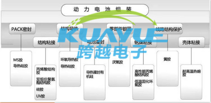 在方型电池中一般会在电池与模块隔板的粘接、电池与模块底板的粘接都是可以用到导热粘接胶等类型的导热胶产品。