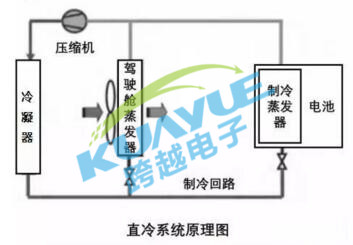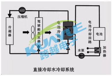 水冷式电池冷却系统采用冷却液 (50%水/50%乙二醇)将电池热里,经电池冷却器传递至空调制冷剂系统,并通过冷凝器传递至环境中,电池进口水温经电池冷却器换热后容易达到较低的温度,可调节电池在最佳工作温度范国内运行;系统原理如图所示。其中制冷剂系统主要部件有: 冷凝器、电动压缩机 、蒸发器、膨胀阀带截至阀、电池冷却器(膨胀阀带截至阀)及空调管等;冷却水路包括:电动水泵、电池(含冷却板)、电池冷却器以及水管、膨胀水箱等辅件。