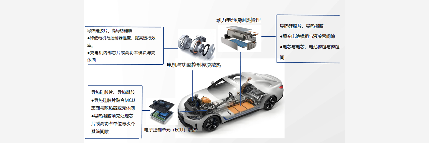 电机控制器(MCU) | 导热硅胶片、导热凝胶 | 导热硅胶片贴合MCU表面与散热器或壳体间 |