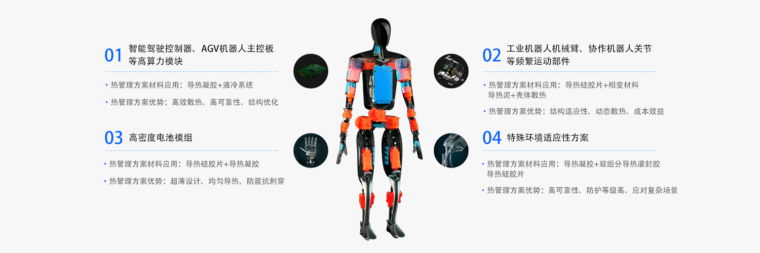 机器人行业热管理方案需结合应用场景、热源特性及系统约束,采用分层设计策略,涵盖材料、结构、主动/被动冷却技术及系统优化。在机器人散热设计中,导热材料的选择需综合考虑导热性能、结构适应性、长期稳定性及成本效益等方面。以下主要针对机器人关键部件提供相应解决方案。